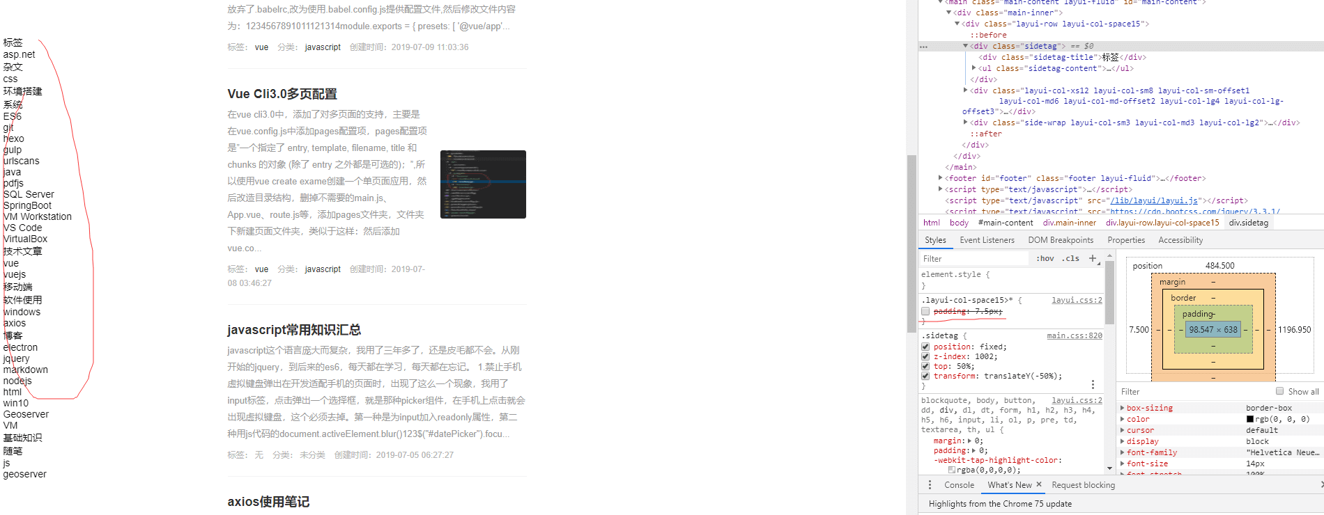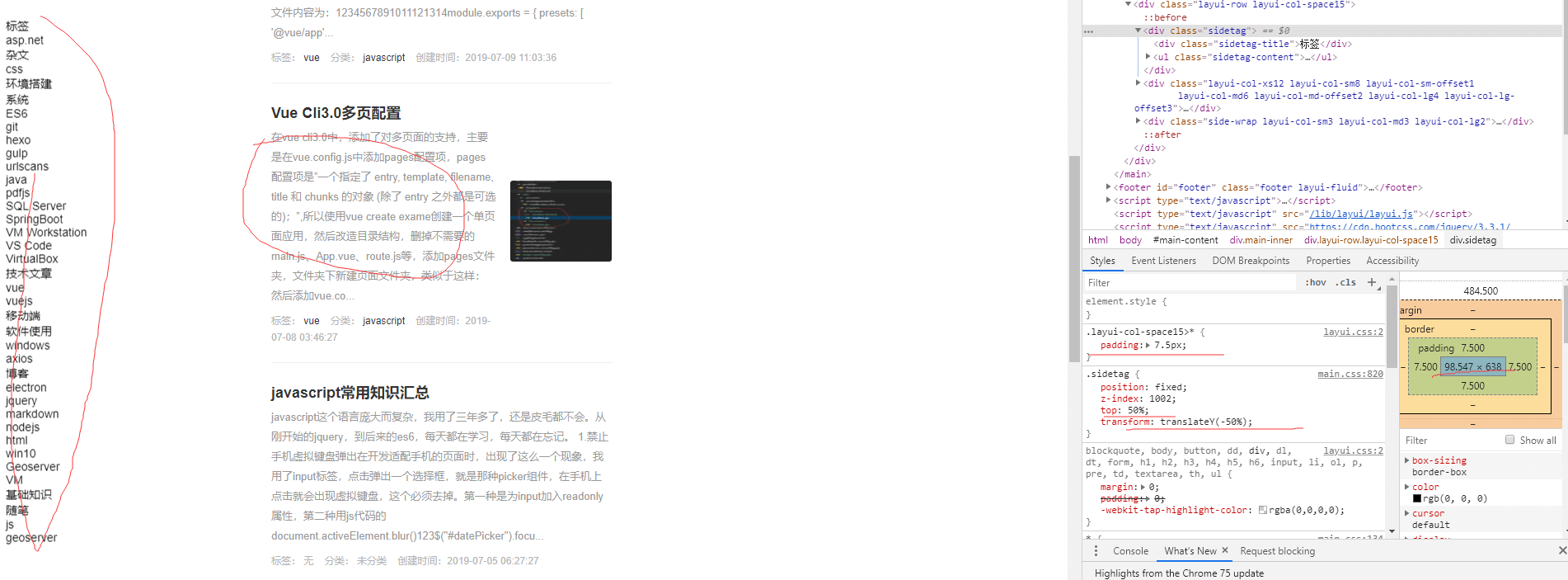 如上图所示,最左侧的标签栏上,在使用transform使div进行居中之后,可以看出字体有明显的模糊状态。解决的办法就是让width或者使height属性值变成偶数即可,我这里有个padding:7.5px的内边距,我让其失效,看看效果: