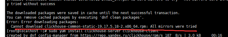 我只能从windows下翻墙下载了clickhouse-common-static-19.17.5.18-2.x86_64rpm安装包,然后使用rz命令上传到虚拟机中然后执行安装
