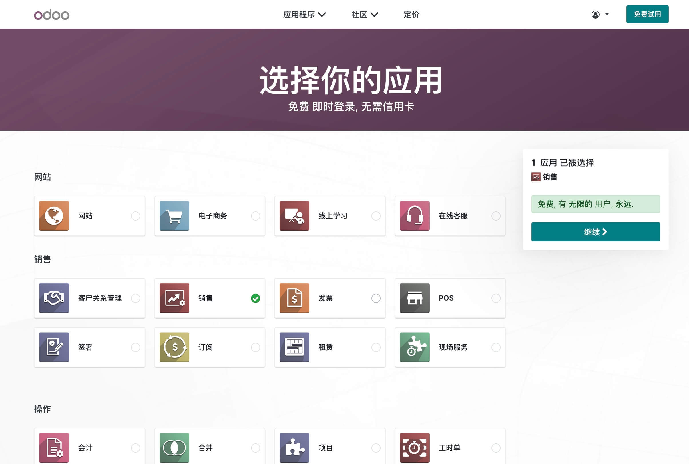 odoo /odoo 这个是一个国外的软件,很多的文章都有这个说明,开源免费,但是我试用了一下,多半都是英文,一时半会让人摸不着头脑。在 免费试用 这个地方,选择需要试用的地方