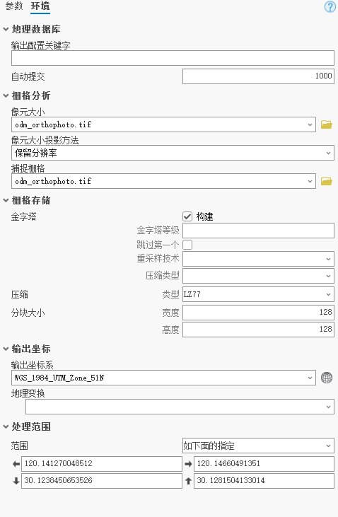 随后点击环境配置:在该部分中,像元大小,捕获栅格输出的坐标均要以最开始参考的影像一致,不然会出现导出的栅格图层与原始的影像像元数不对应的情况, “处理范围” 也要和影像一直。