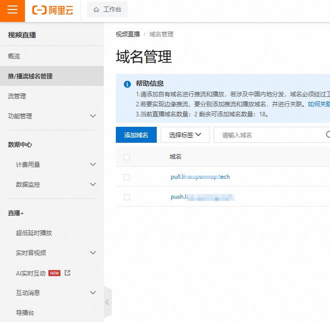 2.配置域名 这里就要到 视频直播 -> 推/播流域名管理 界面增加域名,其实还挺麻烦的,推流和拉流两个域名还不能一样。
