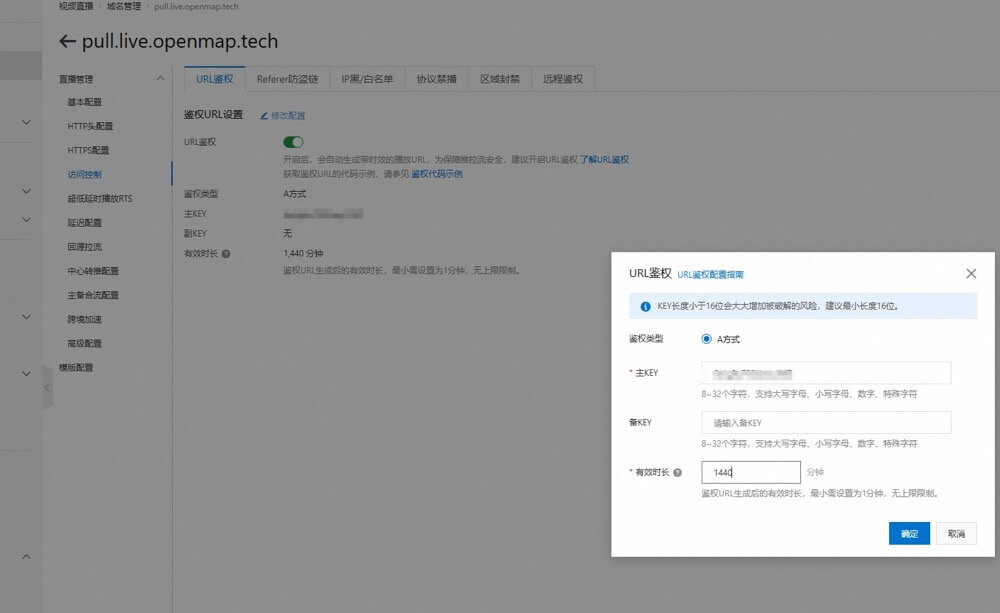 (2)需要注意 pushKey 和 pullKey 不一样,需要在直播域名的详情页的访问控制中进行查看。