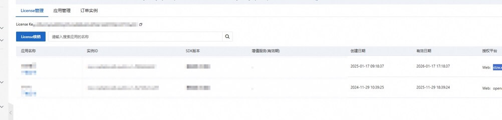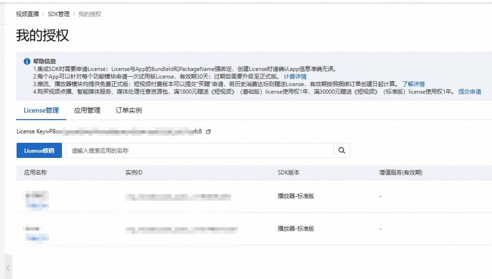 (2) 配置license 直播工具箱 -> SDK管理 -> 我的授权,需要先购买 License,然后创建应用,将 license 和应用绑定就可以了。(多个应用共用一个license)