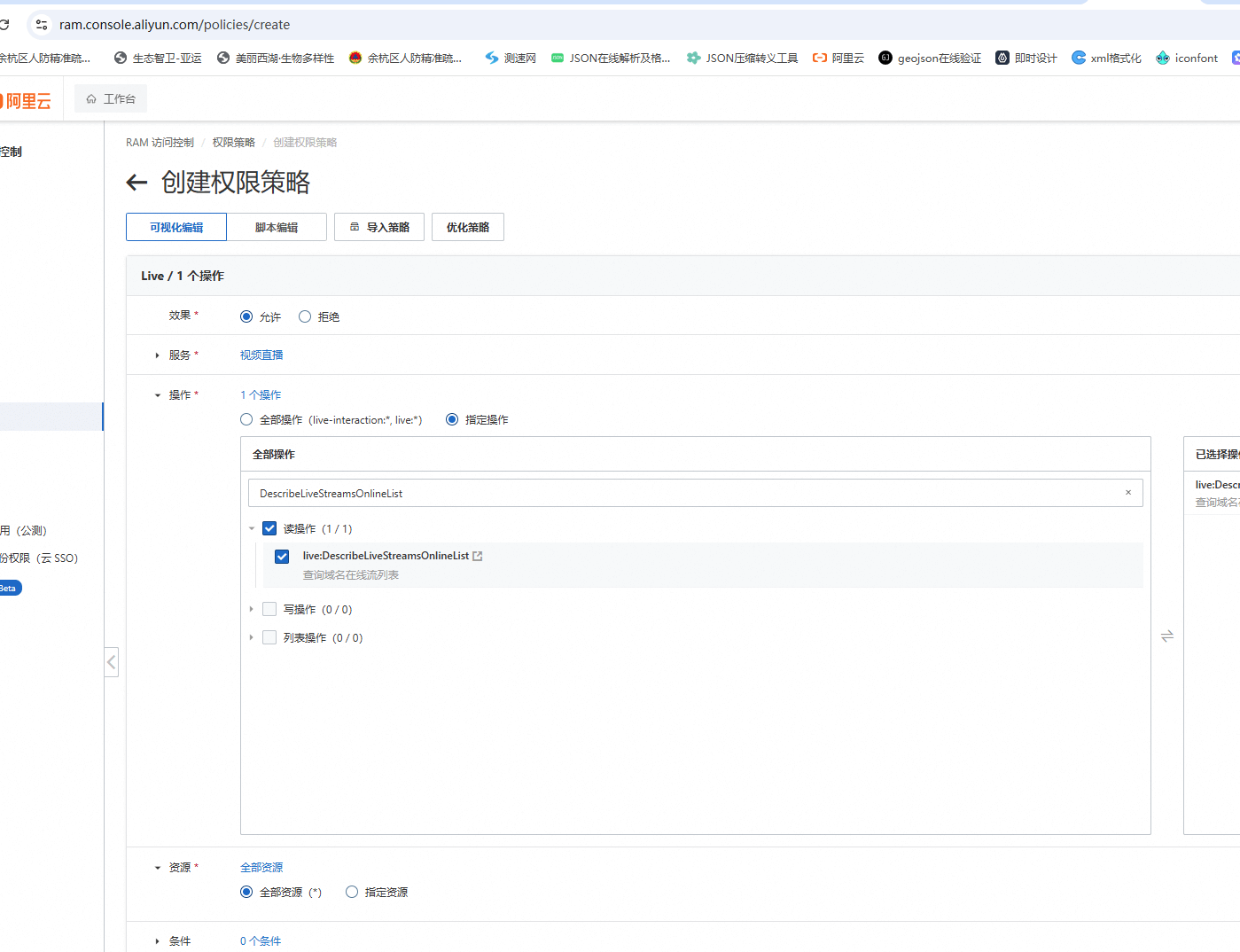 10.在线查询 我根据在线的Demo,然后写了代码,结果总是出现问题,后来只能找工单了,找工单知道了要配置自定义权限策略,我配置了全部权限,也可以配置某一个权限,然后配置给了 RAM,结果还是无法调用,还是报错:Server response has a bad format type: RAW。 (1) 创建自定义授权策略 需要先通过权限控制台,新增一个授权策略,比如读取权限。可以通过选择进行配置,也可以通过编写json进行配置。