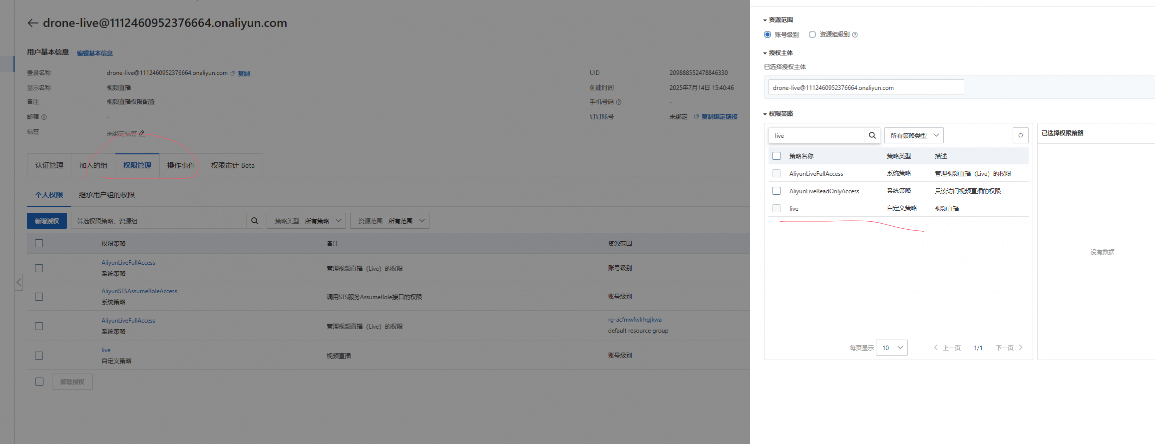 (2) 配置RAM 在控制台上,新增了一个RAM账号,然后配置了 AliyunLiveFullAccess、AliyunSTSAssumeRoleAccess 两个权限,再加上自定义的权限策略。需要在搜索栏中重新搜索