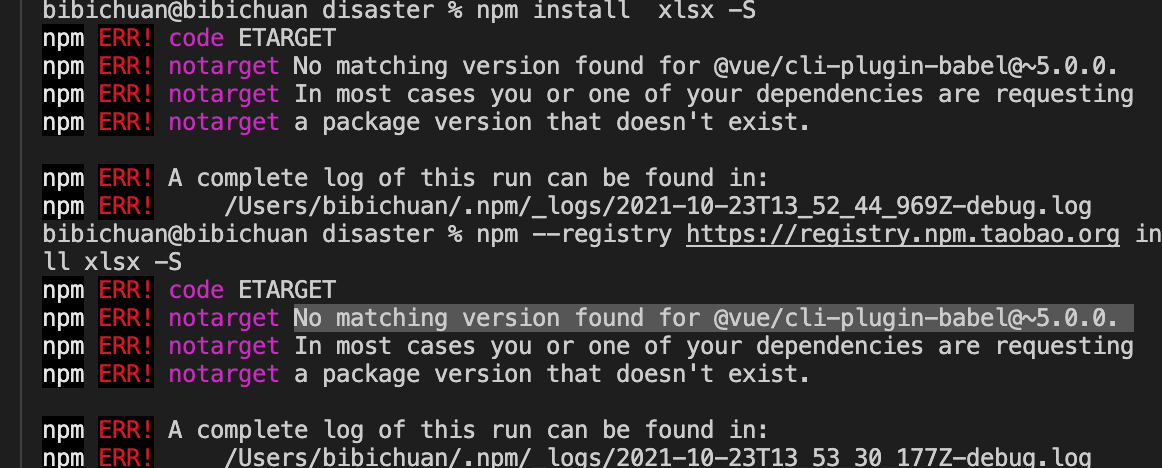 2.解决npm安装错误:No matching version found for @babel/parser^@7.7.4