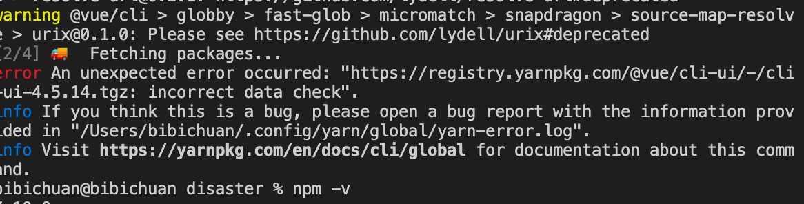结果这个也装不上,报错:An unexpected error occurred: “https://registry.yarnpkg.com/@vue/cli-ui/-/cli-ui-4.5.14.tgz: incorrect data check”。我的node版本是v16.0.0 ,npm v7.10.0。