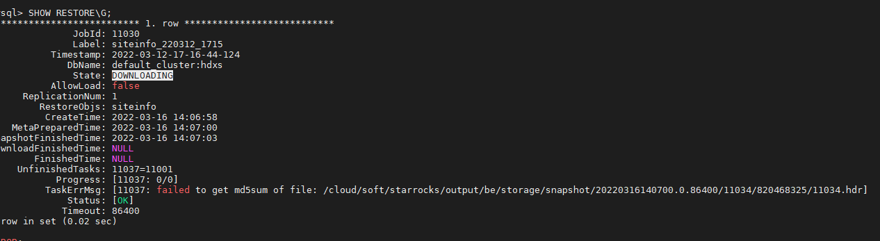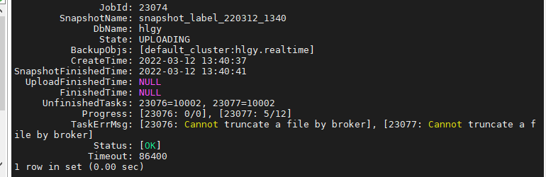 (4) 当通过 SHOW BACKUP 或者 SHOW RESTORE 命令查看作业状态时,有可能会在 TaskErrMsg 一列中看到错误信息,但只要 State 列不为 CANCELLED,则说明作业依然在继续,这些 Task 有可能会重试成功。当然,有些 Task 错误,也会直接导致作业失败。