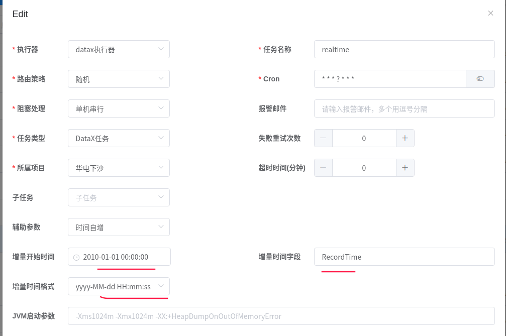 其实我有点蒙,我有一张表叫 realtime ,其中的一个字段叫 RecordTime,是从2012年开始的 yyyy-MM-dd HH:mm:ss 字段格式,我想着用这个字段进行增量配置。主要配置,辅助参数:时间自增;增量开始时间:选择一个时间;增量时间字段:-DlastTime=’%s’ -DcurrentTime=’%s’;增量时间格式:时间戳。