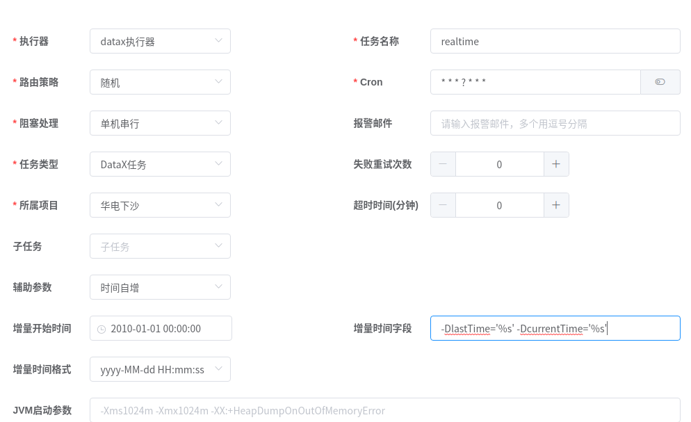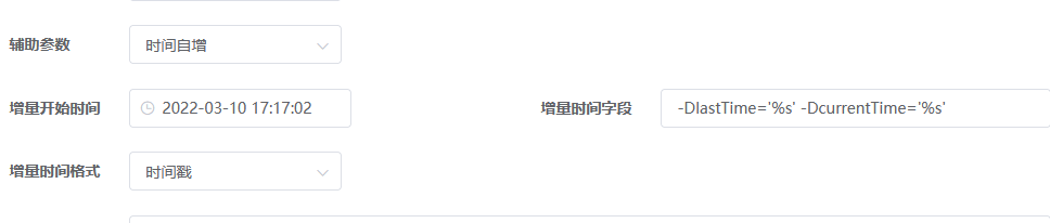 1 | --- 增量开始时间:2022-03-10 17:17:02,增量时间字段:-DlastTime='%s' -DcurrentTime='%s'增量时间格式:时间戳 |