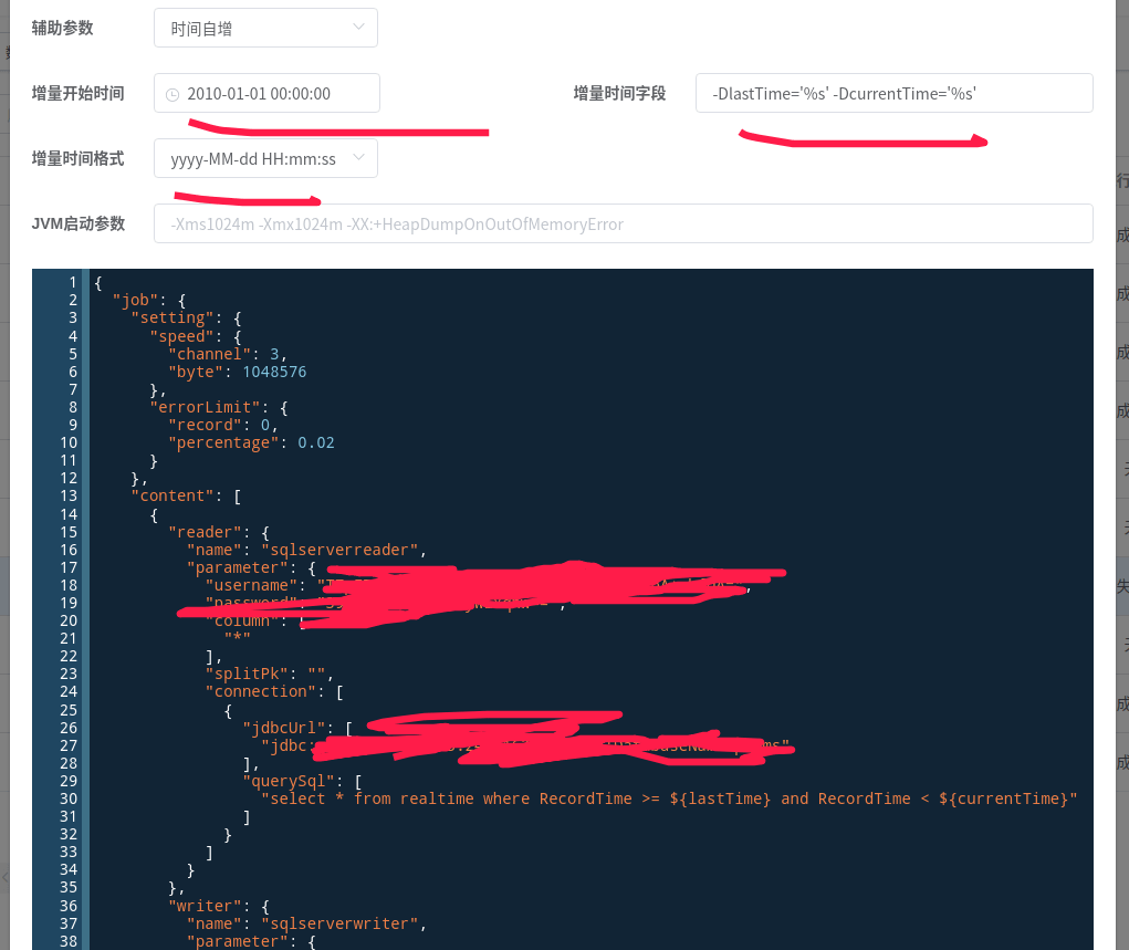 (1) 仓库里面的说明,需要配置querSql,在增量字段里面配置了:-DlastTime=’%s’ -DcurrentTime=’%s’,但是这样配置之后,日志里面出现了:您的配置凌乱了. 因为datax不能同时既配置table又配置querySql.请检查您的配置并作出修改.