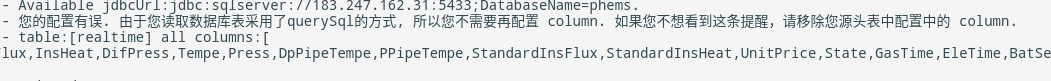 出现了错误:您的配置有误. 由于您读取数据库表采用了querySql的方式, 所以您不需要再配置 column. 如果您不想看到这条提醒,请移除您源头表中配置中的 column.
