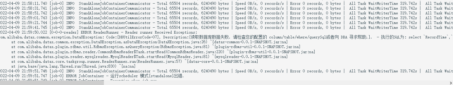 这个错误出现在我使用DataX进行从starrocks数据库读取数据,然后插入到另外一个mysql数据库中,当数据条数达到了 Total 65504 records 记录的时候,数据量已经不再增长了,就一直停留在 65504 记录上,然后运行一天的DataX任务,最后弹出数据库错误,这里是 65504 条数据,我第一运行的时候,是69904条数据,不知道到底是什么原因。