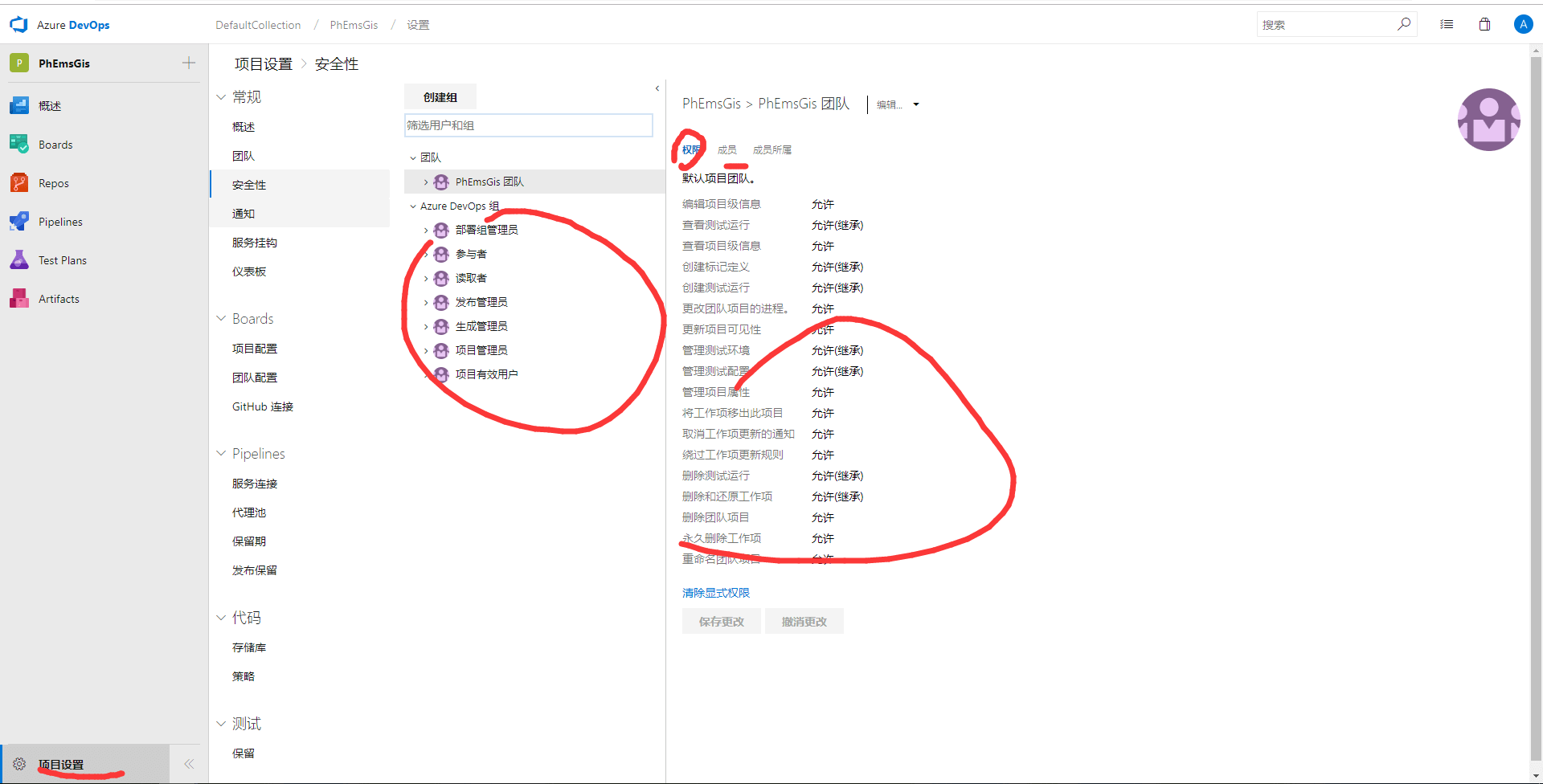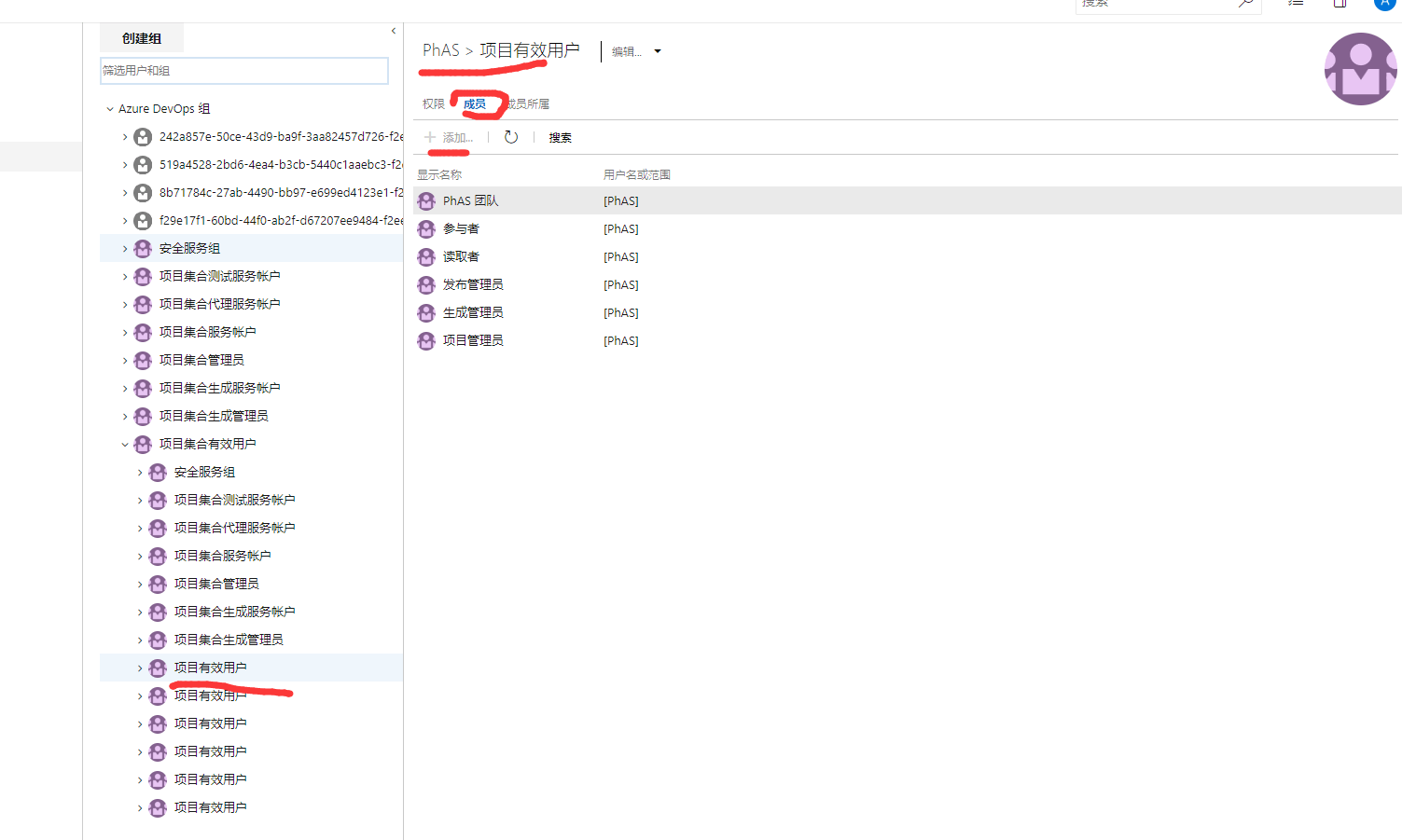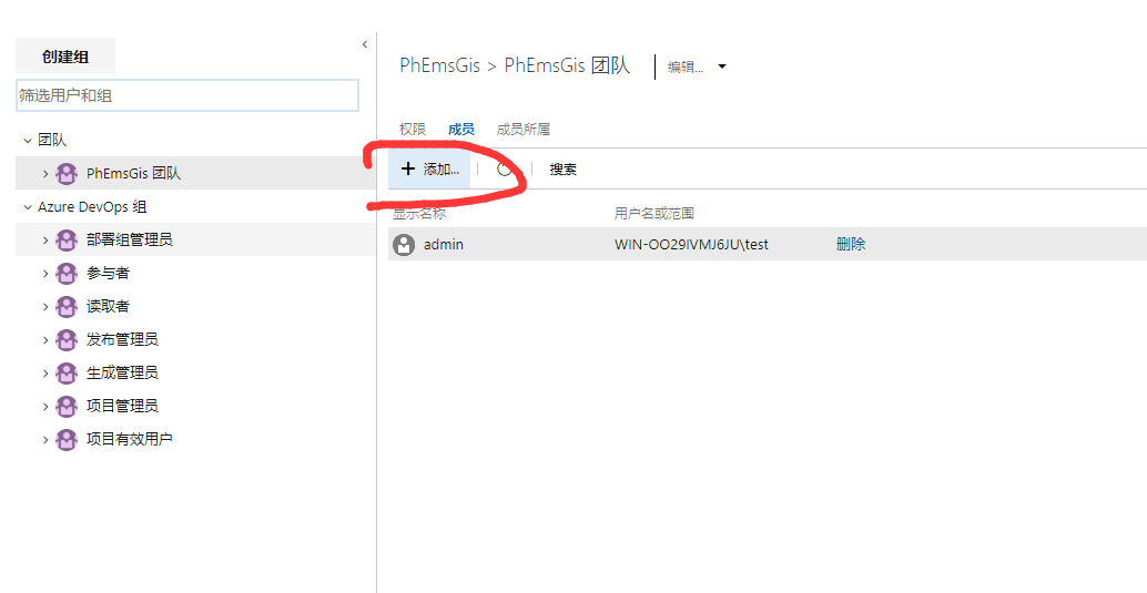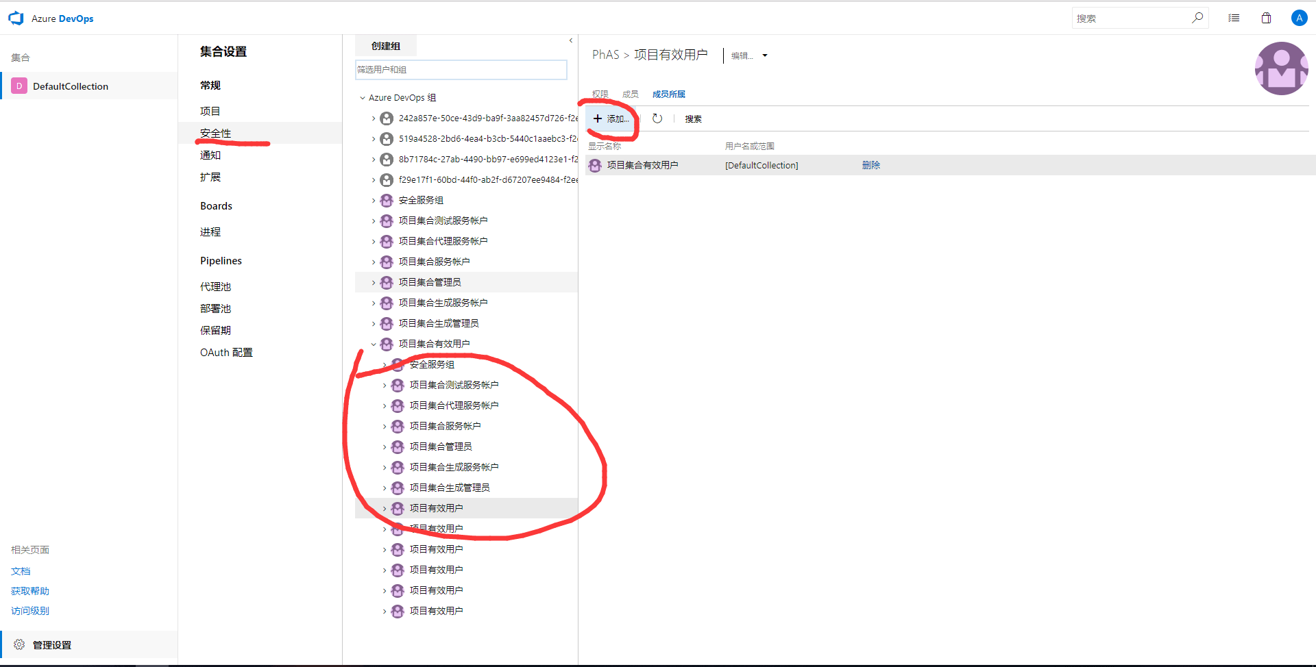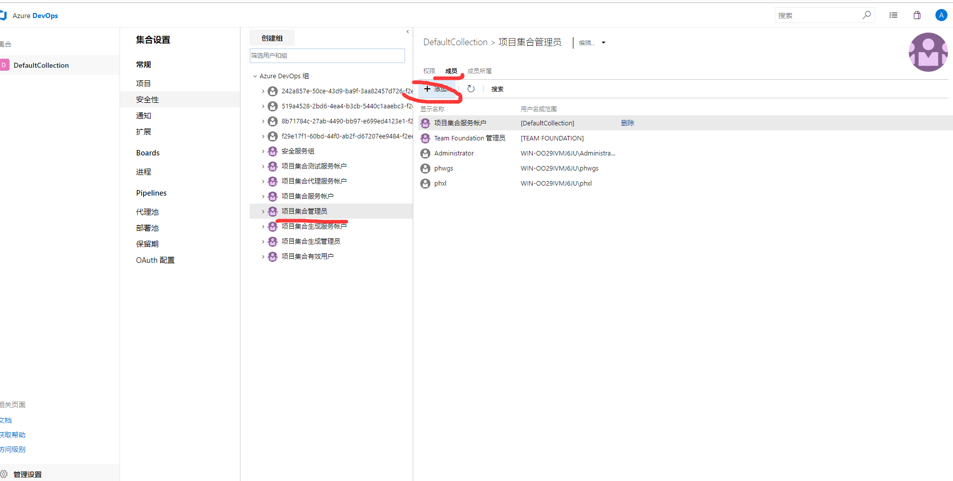 (2) 要么用管理员登录Devops,选择项目设置->安全性->项目集合管理员->成员->添加成员