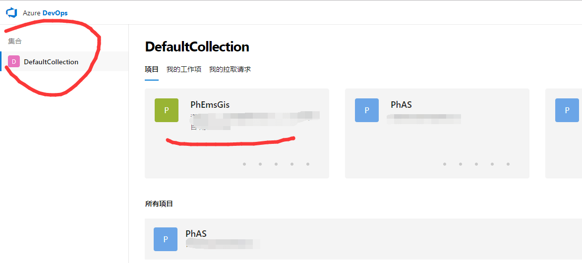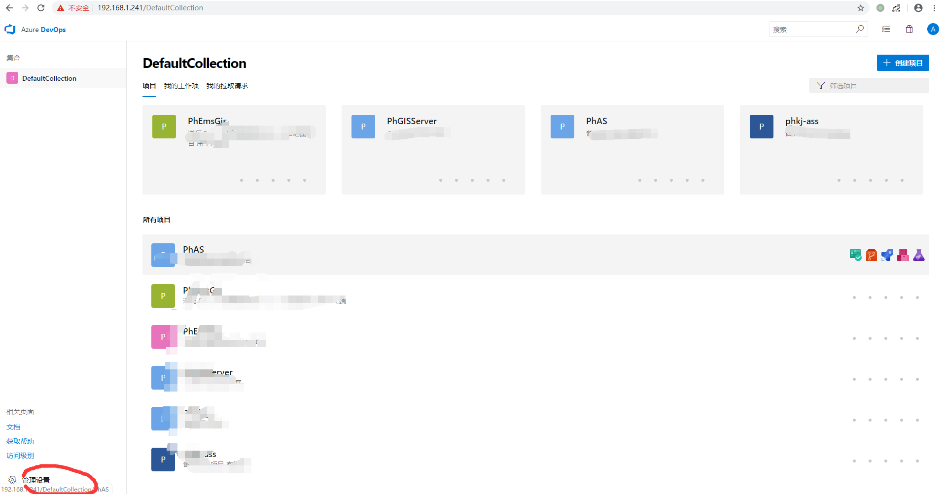 以管理员身份登录(以其他用户身份登录,只能管理自己创建的项目,而不能同时管理全部的项目),点击默认项目集合,选择某一个项目。