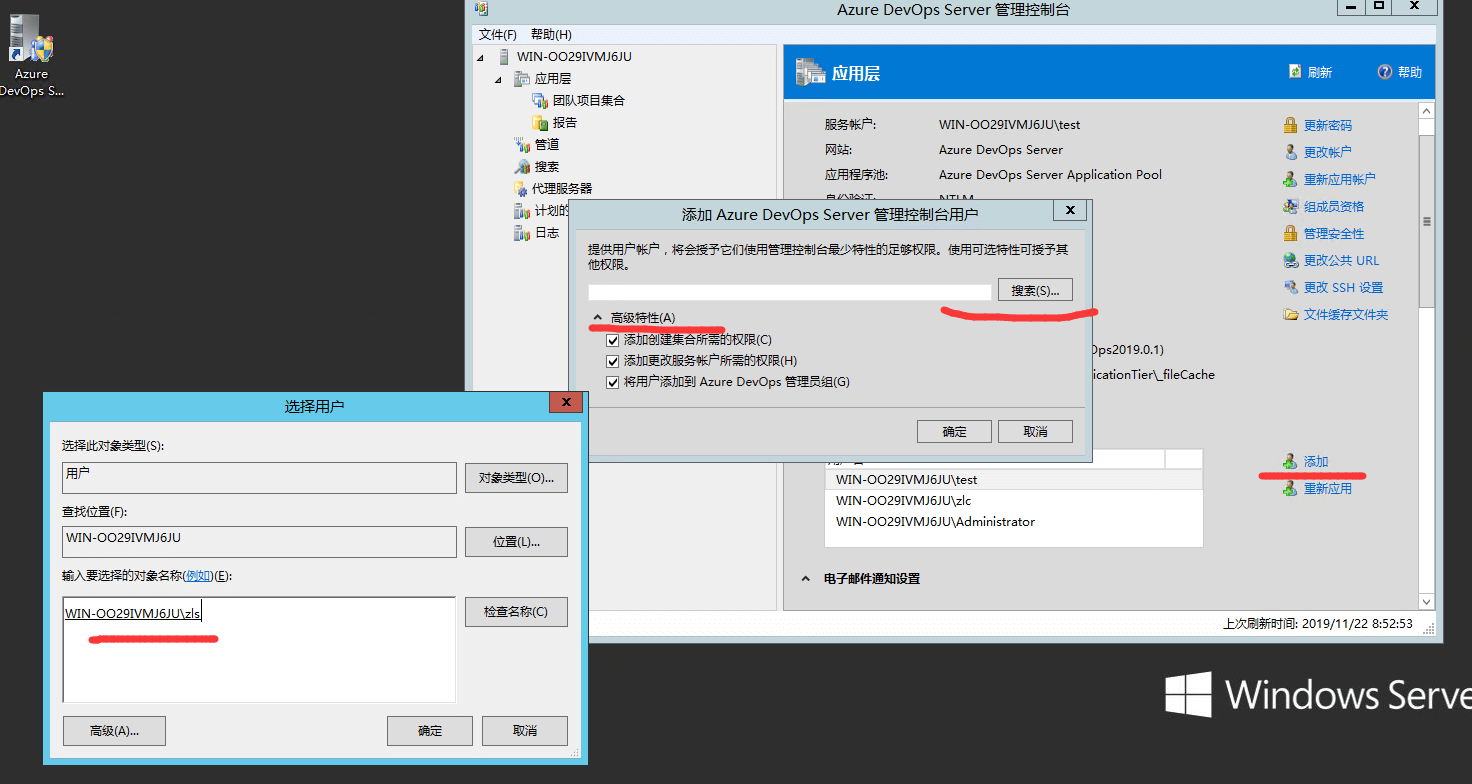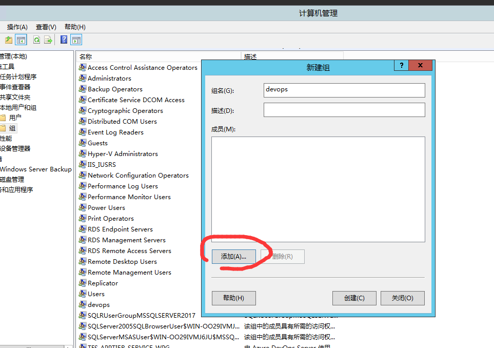 右键新建组,然后通过添加->高级->立即查找->将第一步新建的用户添加入这个devops组中。