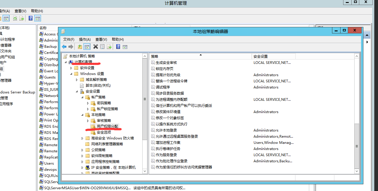 然后依次打开 “计算机配置”——“Windows设置”——“安全设置”——“本地策略”——“用户权限分配”;