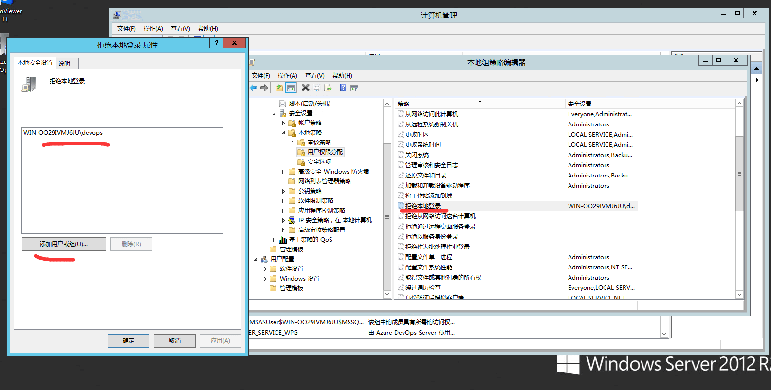 找到右侧的拒绝本地登录,打开添加对话框,将上一步的devops用户组,添加进去。