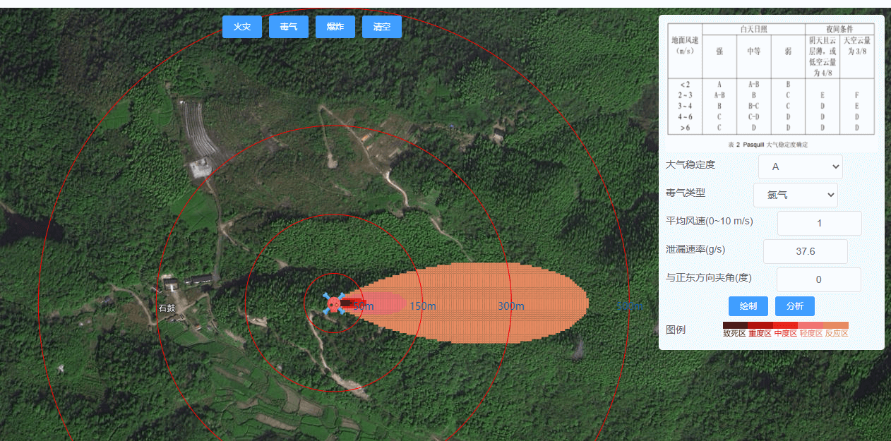 这里是一个演示的例子,也就是通过定义事发地点,然后配置风俗、扩散速度等,可以模拟火灾和毒气的影响范围。