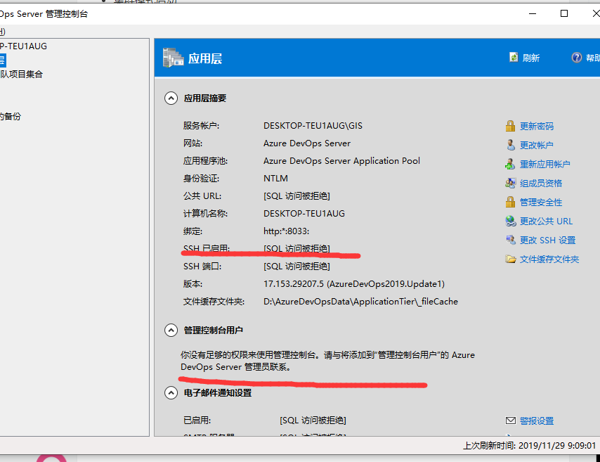 (2) 上面的服务已经启动了,还是报这个错误。还有一个重要的原因,就是因为重新安装的AzureDevops,和通过旧的数据库还原回来的数据,但是在备份和还原的时候没有将ssh密钥备份和还原回来,所以你可以看到在新的服务器上明明没有任何一个ssh密钥,但是增加的时候,却增加不上。就算不增加新的,就是这个密钥已经存在了,但是删除不了,也添加不上,所以有些客户端的ssh密钥还是可以使用,所以会很奇怪。