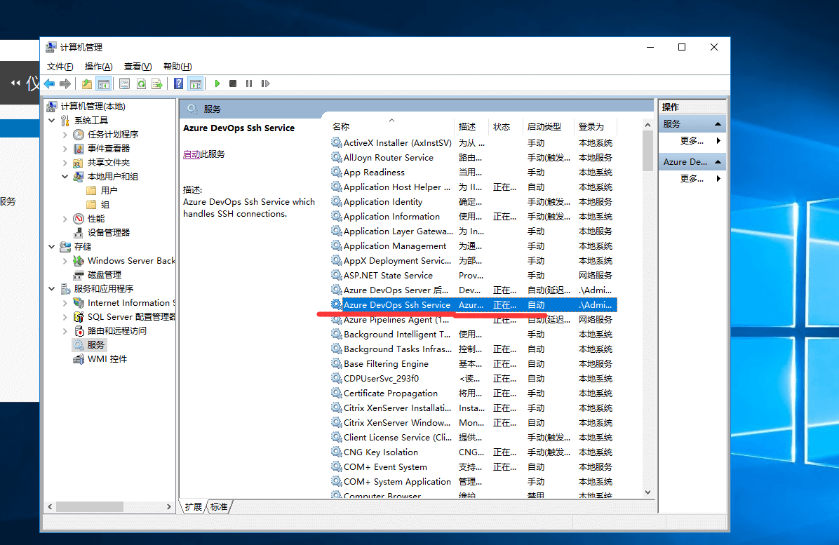 这个时候,查看一下计算机管理->服务->Azure DevOps Ssh Service 这个服务有没有启动,没有启动,要解决错误后重新启动。