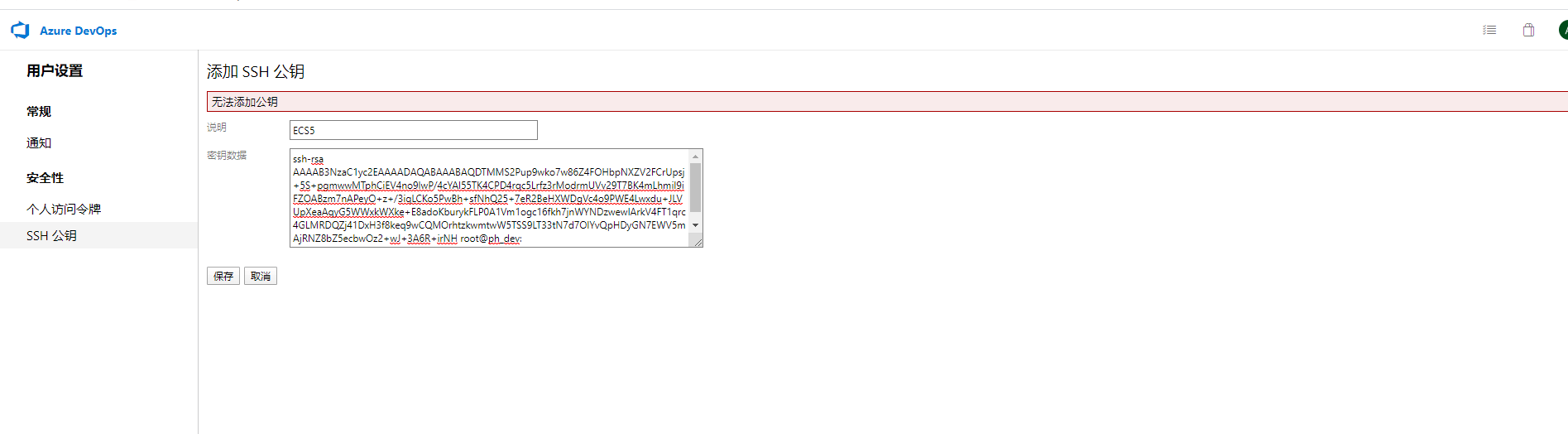 出现这种情况的原因,是因为AzureDevops不允许两个不同的用户添加同一个ssh密钥,也就是说如果一个密钥已经在一个用户下面增加过了,那么其他用户不用增加这个密钥也可以使用这个密钥正常的访问服务器。所以,我换一台服务器,即便我用户名相同,但是也使用的是不同的域,所以就被判定为不同的用户了,自然也就不能看到先前添加的密钥了。同样的,再次添加这个密钥,也就被被判断已经存在了,不允许增加重复的密钥。