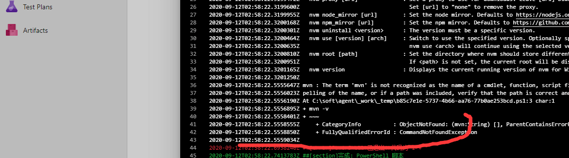 问题出现的原因,就是我在安装了代理池之后,运行了很长一段时间之后,安装了nvm和nodejs,但是在配置部署过程的时候,无论选择是在代理池上运行cmd程序还是PowerShell脚本,最后都会部署失败。但是我在安装了代理池的机器上的命令行中,直接运行:nvm -v 命令,确实可以找到相关命令的,但是在AzureDevops页面中运行,就是回报找不到相关的命令。