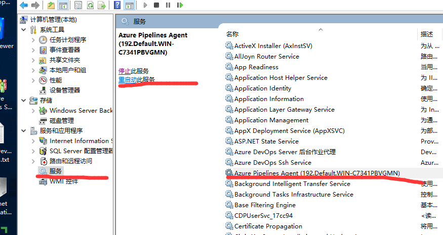 重启服务器,然后查看系统服务中的两个AzureDevops的服务是否以正确的权限运行。(实际上,我忘记了到底是怎么解决的了。)
