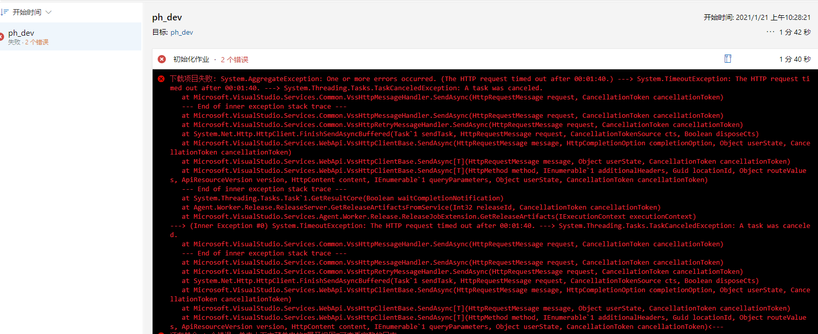 在很长一段时间内,AzureDevops都运行的很好,但是突然有一天,出现了无法自动部署的问题,但这之前,我没有修改服务器的任何配置。查看部署日志,无论是任何项目,都出现了:(The HTTP request timed out after 00:01:40.) —> System.TimeoutException: The HTTP request timed out after 00:01:40. —> System.Threading.Tasks.TaskCanceledException: A task was canceled.