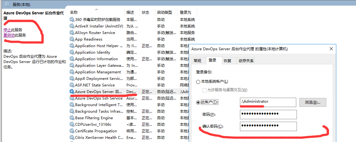 于是我将服务中的Azure DevOps Server这个服务的登录用户,换成了Administrator,具有管理员权限的用户,然后停止服务,重新启动,最后果真可以执行完整备份了。同时,发布也可以执行了。有点小激动啊。