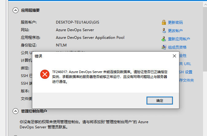 也是因为我使用了test账户安装了AzureDevops,后来我开启了Administrator账户,使用Administrator账户登录后,管理控制台就无法连接数据库了。