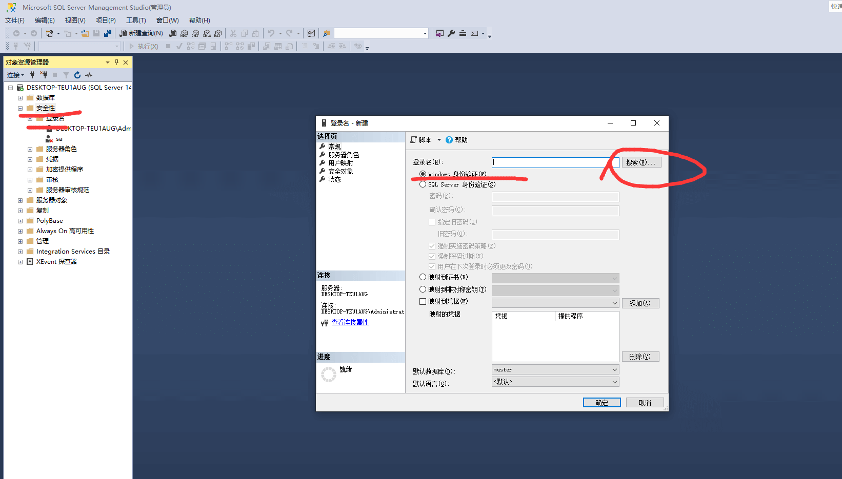(1) 这里我采用了先切换到登录时候安装时候的用户,连接数据库,然后在安全性上,添加登录名,将Administrator登录添加进去,然后退出test账户,用Admministrator登录系统,这个时候就可以用Administrator连接数据库了。这也是一个曲线救国的策略啊。