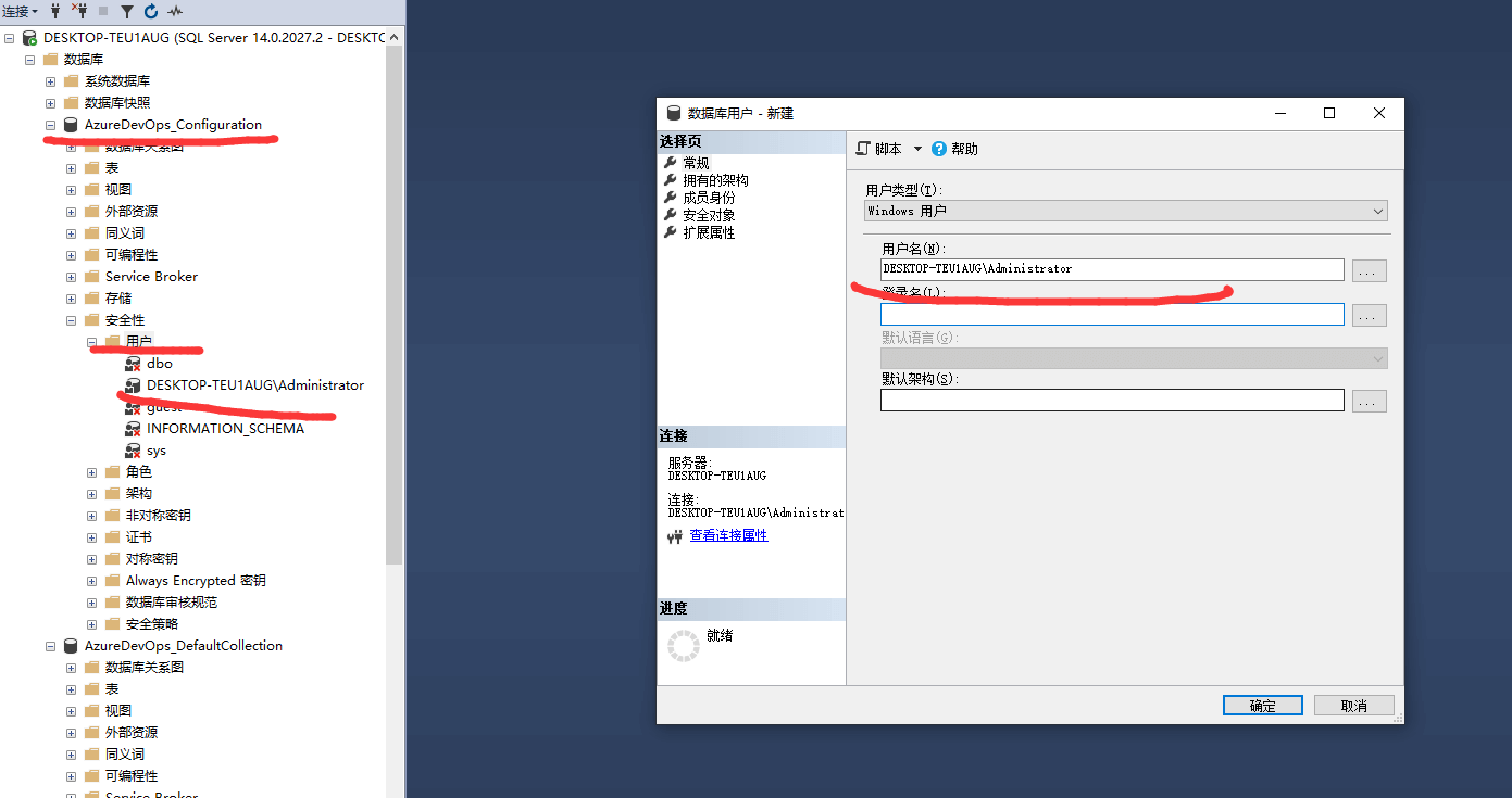 最后问题终于还是让我解决了,主要还是用户权限的问题。在上一步添加Administrator用户的时候,也要赋予相应的db_owner权限,才可以。重新以test登陆系统,然后连接服务器,打开数据库AzureDevOps_DefaultCollection和AzureDevOps_Configuration,选择安全性->用户->Administrator->右键属性->成员身份这里->选择dbo_owner就好了。