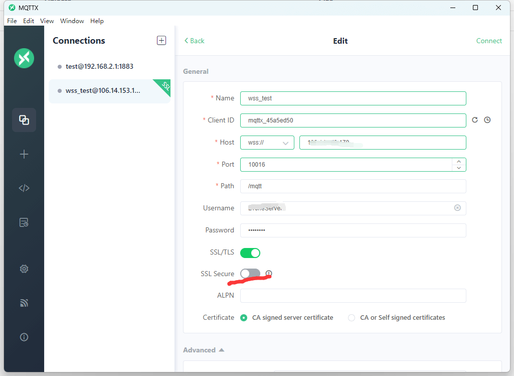 测试可以使用 MQTTX 客户端进行测试,新建一个wss连接,然后选择连接就可以了。这里有一个 SSL Secure 配置,不能打开,打开就报错了。