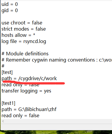 打开windows端的rsync.conf配置文件,其中的path, /cygdrive为固定,/c表示c盘,/work表示c盘的work文件夹,在c盘新建一个work文件夹即可,同理,在其他磁盘中的文件夹,只需要填写相应的盘符就好。