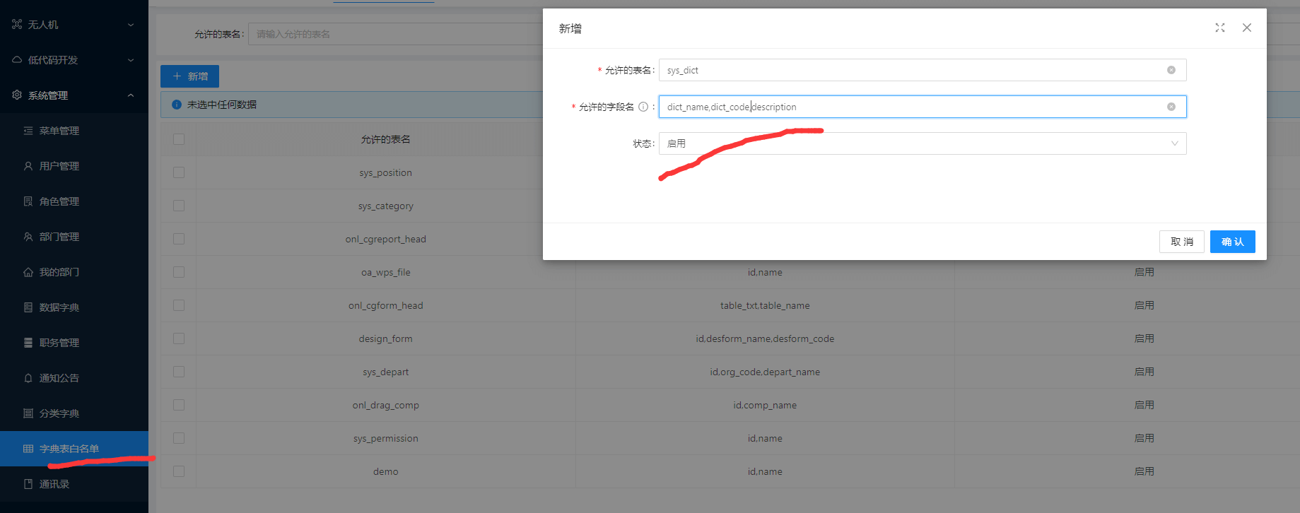(2)打开白名单配置菜单,然后添加白名单配置,输入 表名:sys_dict,允许的字段名:dict_name,dict_code,description,然后点击确定就可以了。