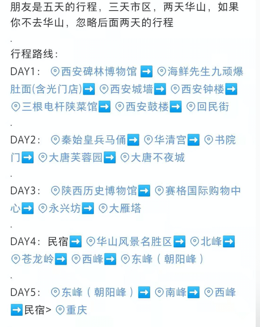 网上还是有不少的参考的,主要的景点有秦始皇兵马俑、陕西历史博物馆、大雁塔、大慈恩寺、大唐芙蓉园、大唐不夜城、西安城墙、西安钟楼、鼓楼、回民街、书院门、碑林博物馆、永兴坊、大明宫、青龙寺、兴庆宫公园、华清宫,还有很远的华山景区