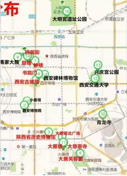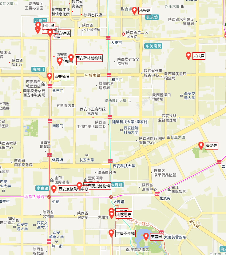 西安城墙->西安钟楼->西安鼓楼->书院门->西安碑林博物馆->永兴坊->大明宫