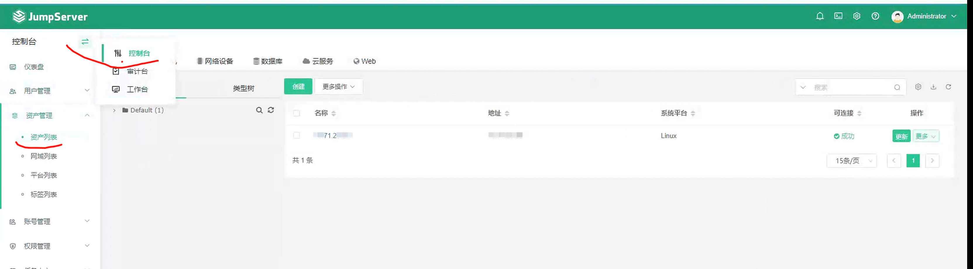 点击页面左侧的控制台,资产管理 - 资产列表 - 主机 - 创建 创建一台 Linux 服务器,并在创建资产过程中,创建特权用户,内容就是上面表单的 管理员用户 和 密码。