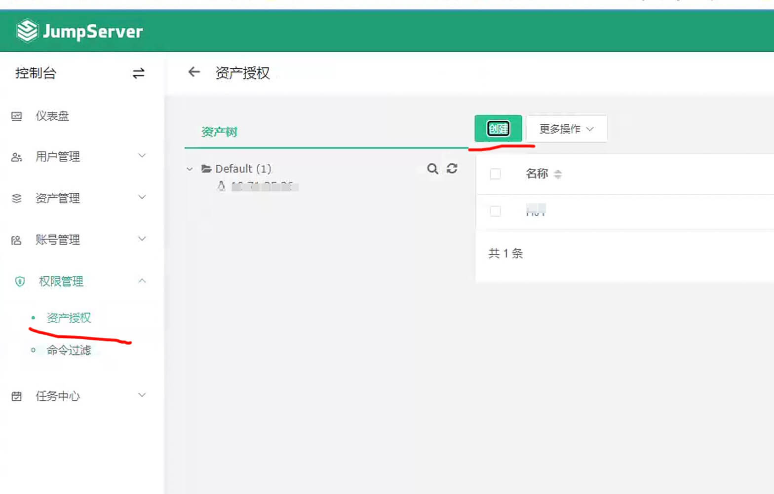 创建资产之后,还需要将资产授权给某一个用户,就算是Administrator账号也不行。点击页面左侧的 权限管理 - 资产授权 - 创建 创建一个授权。