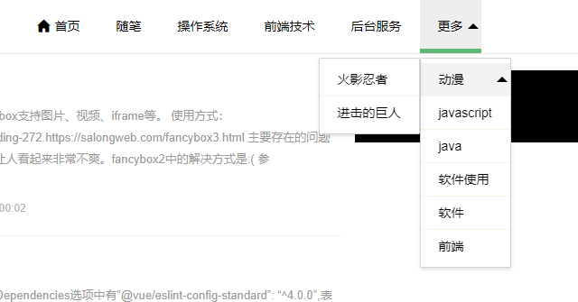 其实主要思想就是,我把自定义的菜单和hexo生成的文章分类都放到一个menu数组里了,然后根据这个数组生成一个菜单,这个菜单可以说相当复杂,如果菜单数超过4个,就把剩下的放到更多里面,如果没有超过四个,那就挨个排列显示。如果菜单有子菜单,还要把他放到dd标签里面,再更多这一栏的下拉菜单中,还有可能生成三级菜单。首先判断菜单数是否大于4个,不大于3个,就直接遍历生成菜单,如果有子菜单的话,就多套一层。如果菜单数大于4个,先是遍历,把前四个生成出来,然后添加一个更多按钮,再遍历一次菜单数组,将前4个过滤掉,从第四个开始遍历,挨个添加到更多这一个菜单中,如果在遍历的过程中,发现这个菜单有子菜单,那就再遍历一遍子菜单生成一层,如果没有子菜单了,就直接输出菜单明就好了。(费老劲了,都不知道这有啥用。)
