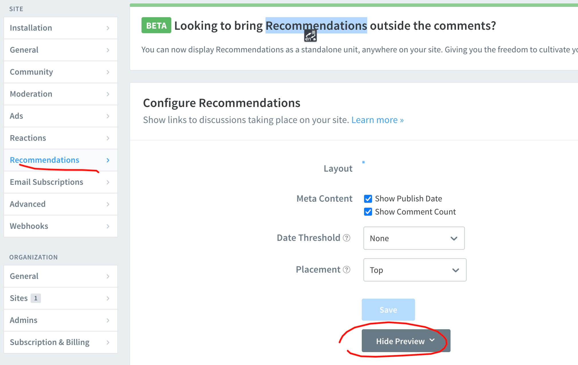 (2) 第二种方法就是,可以通过 Disqus 按右上角的 Admin 進入後台管理,选择要管理的站点,然后找到 Settings,选择Recommendations,这里面有相关的配置。可以关闭显示,甚至可以直接关闭