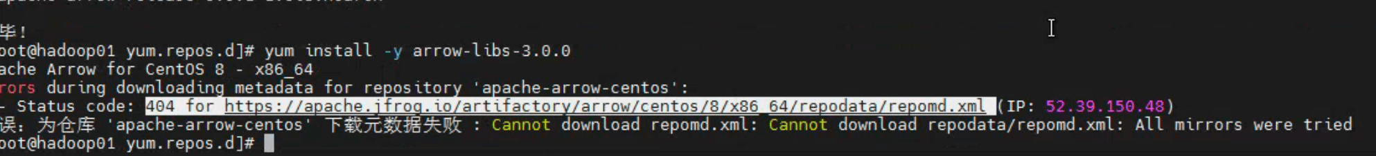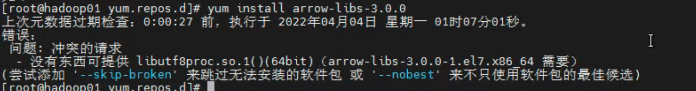1 | [root@hadoop01 yum.repos.d]# yum install arrow-libs-3.0.0 |