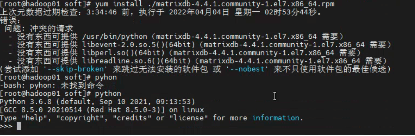 虽然我经过问题解决,安装了python36,安装了 arrow-libs parquet-libs,使用官方下载的安装包:yum install matrixdb-4.4.1.community-1.el7.x86_64.rpm 安装数据库的时候,还是报错了。我不禁开始骂人了,这个数据库说的倒是挺牛的,可是安装起来这么麻烦,网上的资料又非常的少,而且都是官方的文档,连一篇其他的转载都找不到,可能真是很少有人知道怎么安装吧。