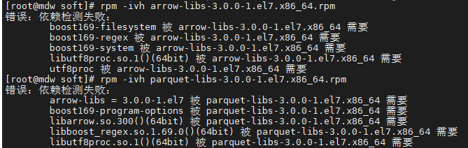 手动安装了 arrow-libs-3.0.0-1.el7.x86_64.rpm 和 parquet-libs-3.0.0-1.el7.x86_64.rpm 两个包,也是报错