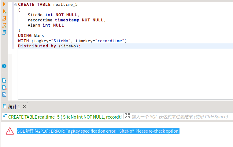 创建表的时候,不支持大写,当把siteno改为 SiteNo,结果就会报错:SQL 错误 [42P10]: ERROR: TagKey specification error: “SiteNo”. Please re-check option.