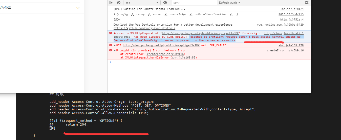 其中如果不配置$request_method = ‘OPTIONS’这个,还是会出现:”Response to preflight request doesn’t pass access control check: No ‘Access-Control-Allow-Origin’ header is present on the requested resource”