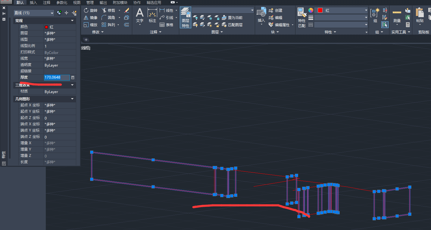 2.为什么我画的CAD图形有厚度?如何设置CAD图形的厚度? (修改厚度值的设置只会影响新创建的图形,之前已经绘制的图形是不会受影响的,要将之前创建图形的厚度也改为0,只能是选中这些对象,然后在属性框(CTRL+1)中将厚度值统一改为0)