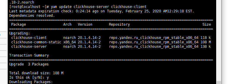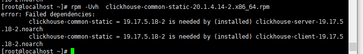 因为我的clickhouse-common-static是使用的rpm的方式安装的,所以我需要做的就是使用rpm方式升级。但是我下载了clickhouse-common-static最新版,执行了rpm -Uvh clickhouse-common-static-20.1.4.14-2.x86_64.rpm,结果显示这个包被别人依赖了。