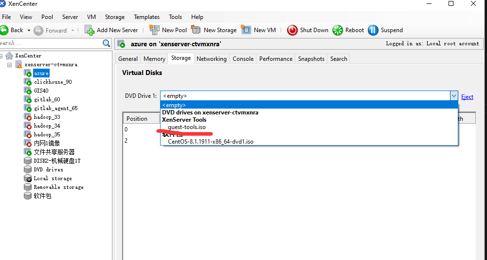 后来我在虚拟机的Storage选项中的DVD Drive中找到了一个guest-tool.iso,进行了挂载。
